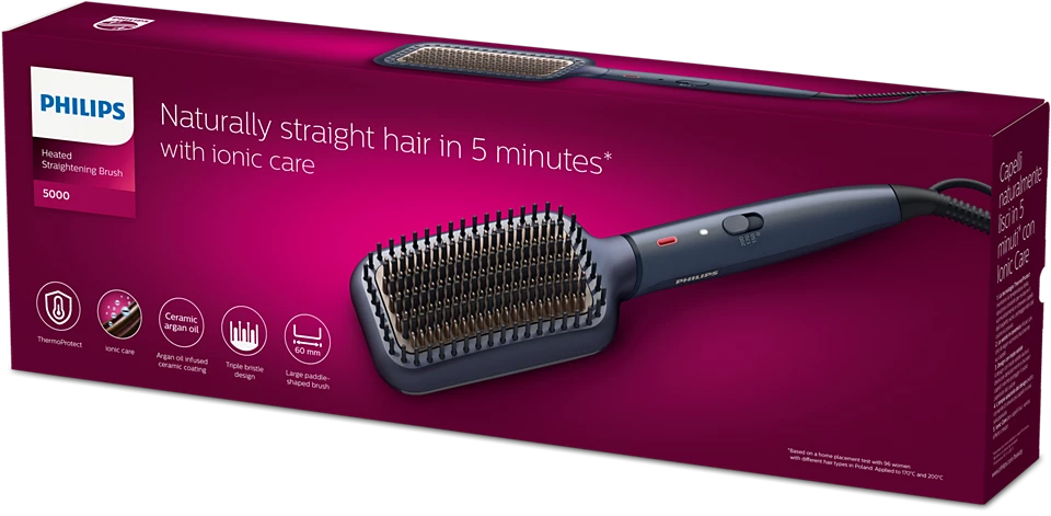 Yalnızca 5 dakikada doğal görünümlü düz ve harika parlaklıkta saçlara sahip olun. İyonik bakım sistemine sahip ThermoProtect teknolojimiz ve fırça ucu tasarımımız sayesinde saçlarınız sağlıklı görünür ve elektriklenmez.